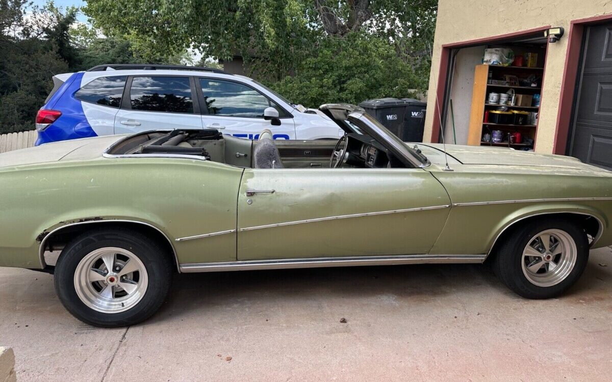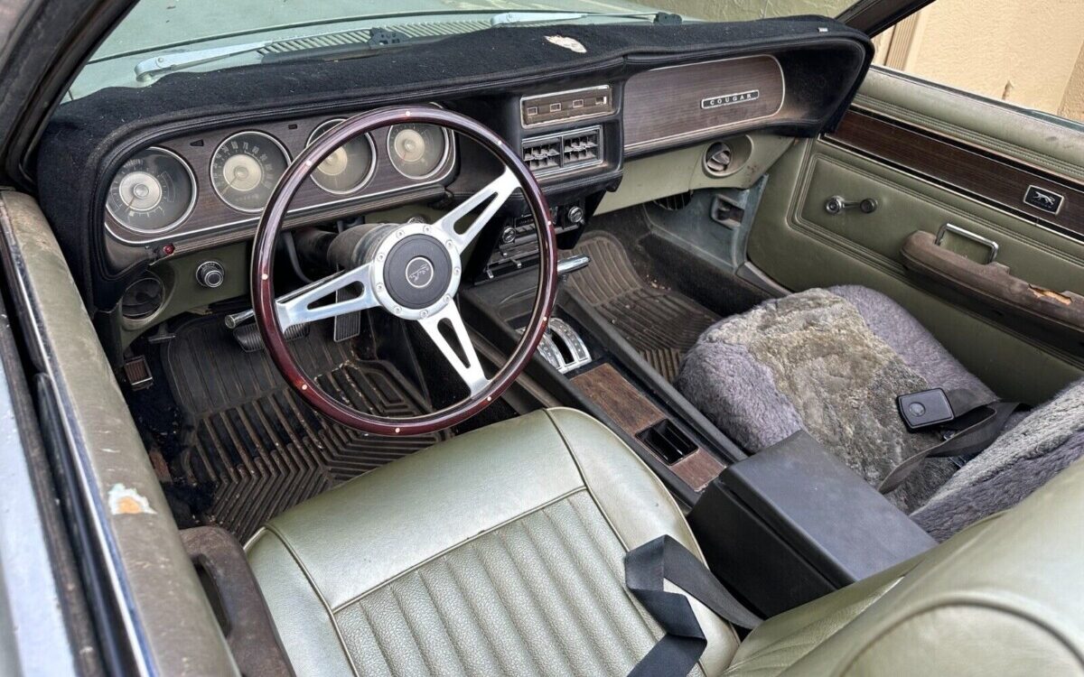 The seller tells us, “She is a driver from day one. Needs body work. You can see in the pics“. What I see in the pics is a badly faded Medium Green Metallic finish, some Bondo in the driver’s side fender, and a slight dent in the passenger side door but I also see a fairly straight and complete body. Some of the trim is missing (fender eyebrows and driver’s side bump strip) but the rest appears to be there. The folding top, which works, is said to be four years old and the wheels are reproductions of original Cougar pieces.