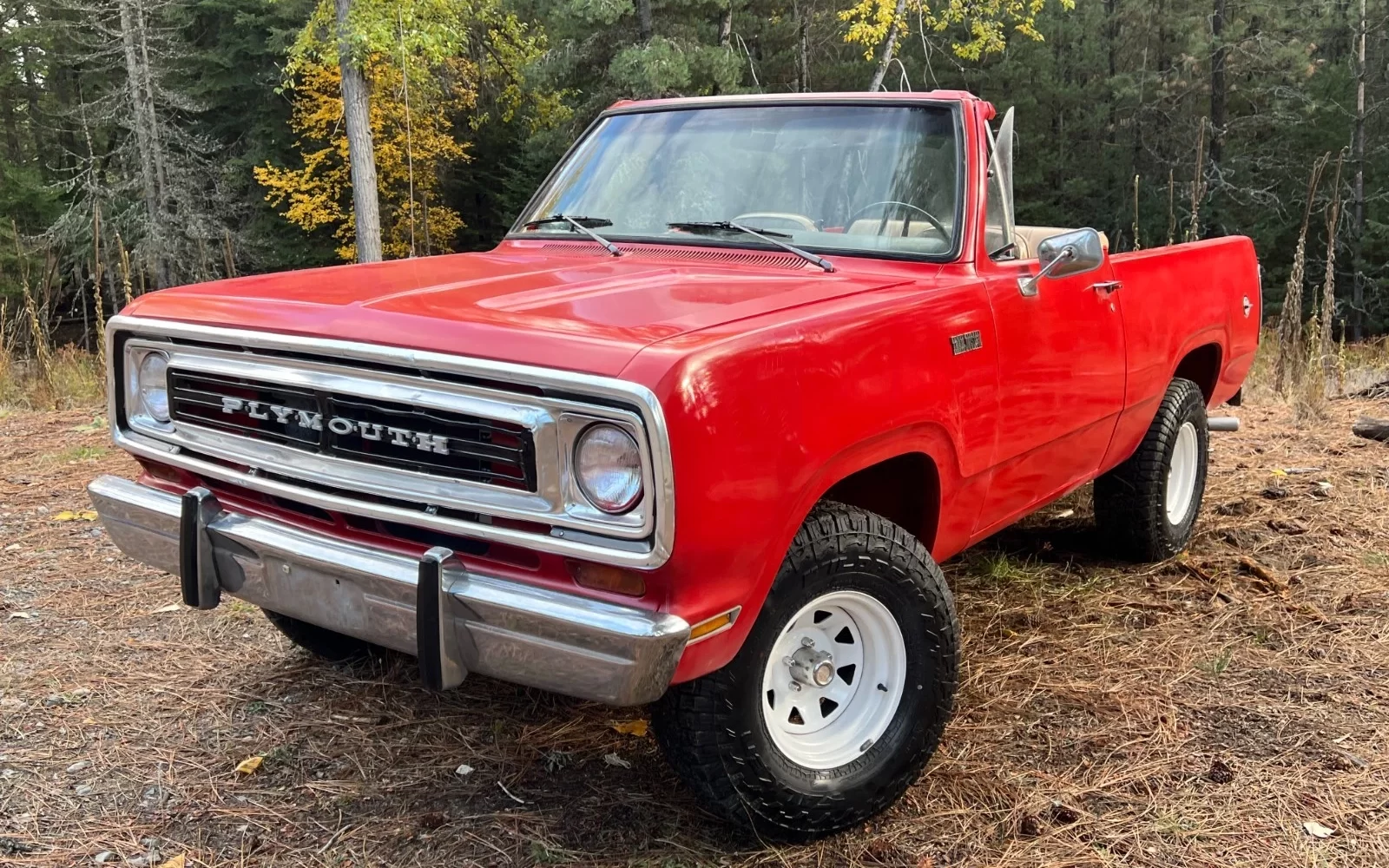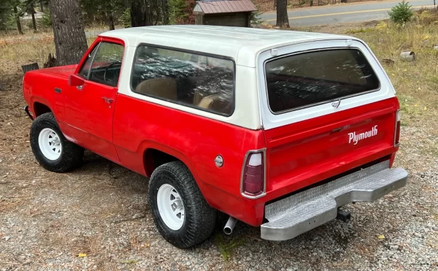 Sporting shiny Rally Red paint and oversized tires on crisp white wagon wheels, this first-year Trail Duster seeks a new owner who appreciates these interesting and somewhat rare trucks. The 1974 Plymouth Trail Duster comes to market here on eBay after a previous auction ended with no sale. At least five bidders have its market value over $8500 with about a week to go. Plymouth entered the two-door 4×4 market with a pickup-based two-door like General Motors’ Chevrolet Blazer and GMC Jimmy rather than engineering a unique and smaller Jeep-sized offering. This may have alienated buyers looking for a trail-sized back-woods crawler, but certainly kept parts and maintenance costs down by sharing the proven half-ton truck platform. Only early 1974 specimens like this Hayden, Idaho classic got the half doors with no window frame, making this full-convertible unit even more rare. By late ’74 and beyond, the Trail Duster and its Dodge Ramcharger sibling made due with fully-framed doors.