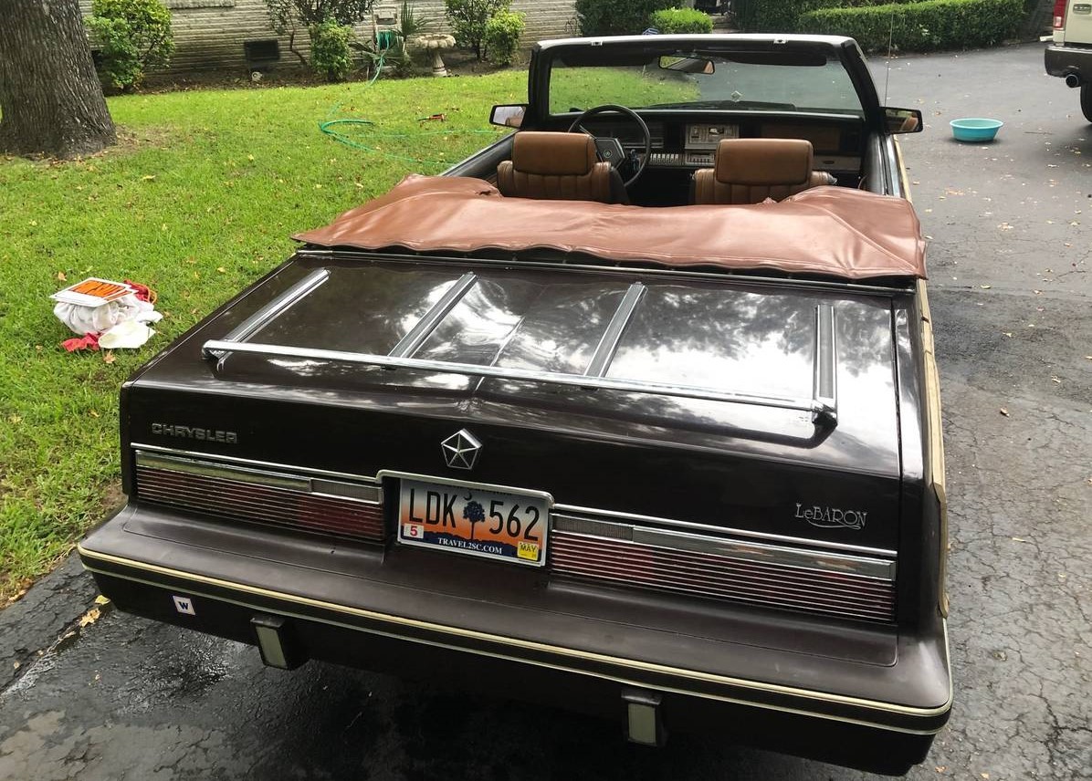 This 1983 LeBaron is a two-owner car that is said to have traveled just 23,500 miles in its 37 years. Until 2014, it was a Texas car, then it went to South Carolina where it acquired the South Carolina license plates it currently wears and is now for sale in Virginia. The body looks straight and solid with no signs of rust, and the fake woodgrain siding looks up to par. That’s a key statement because rehabbing or replacing that material can’t be easy or inexpensive. The dark brown paint is nice and shiny and matches well with the leather interior colors. The convertible top boot is beautiful, but somehow the color is off compared to the seats, so I’m guessing this is a replacement and not the one that came with the car.