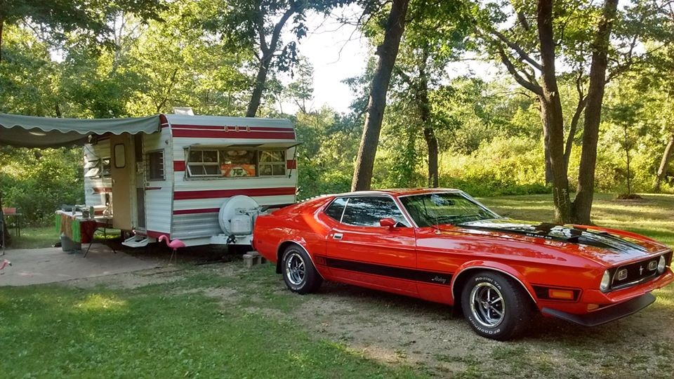We look now at the red-and-white unit for sale. For an asking price of $4500, the seller says that the interior has been updated a bit, it has a half-bath (no sink), and the original avocado-green stove works. Apparently, the fridge works also, and they’ve added a roof air conditioner, (helpful during hot summer days). We’re told that it has a working heater, a total of 4 beds, and weighs in at around 2000 pounds dry, which should be fine for most medium-sized vehicles to tow. (No, the Mustang is NOT included!)