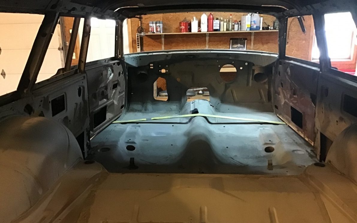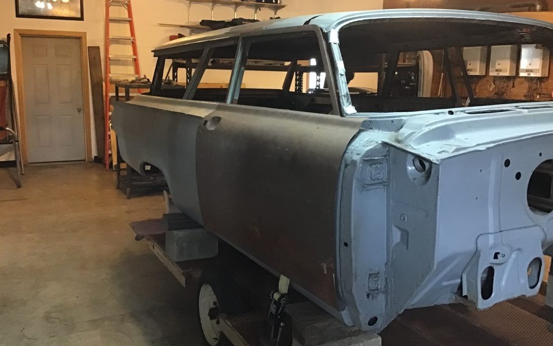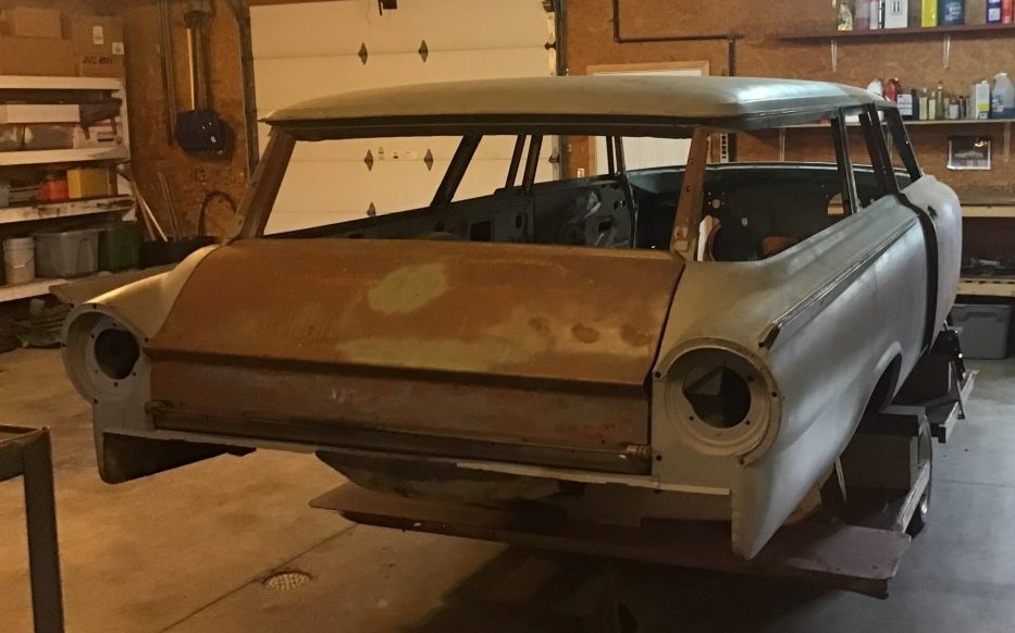 As can be seen, this Ranch Wagon is experiencing a metamorphosis. Besides the obvious – the completely stripped body, it’s in the process of losing some height, courtesy of a 2″ chop, but that will need to be continued by the next owner. The body is described as rust free and the seller adds, “All original glass, trim, and lighting are here and in excellent condition“. In addition to the body blast, the frame and suspension components have been likewise treated. Yes, the doors and hood, along with many other parts, are included in the sale.