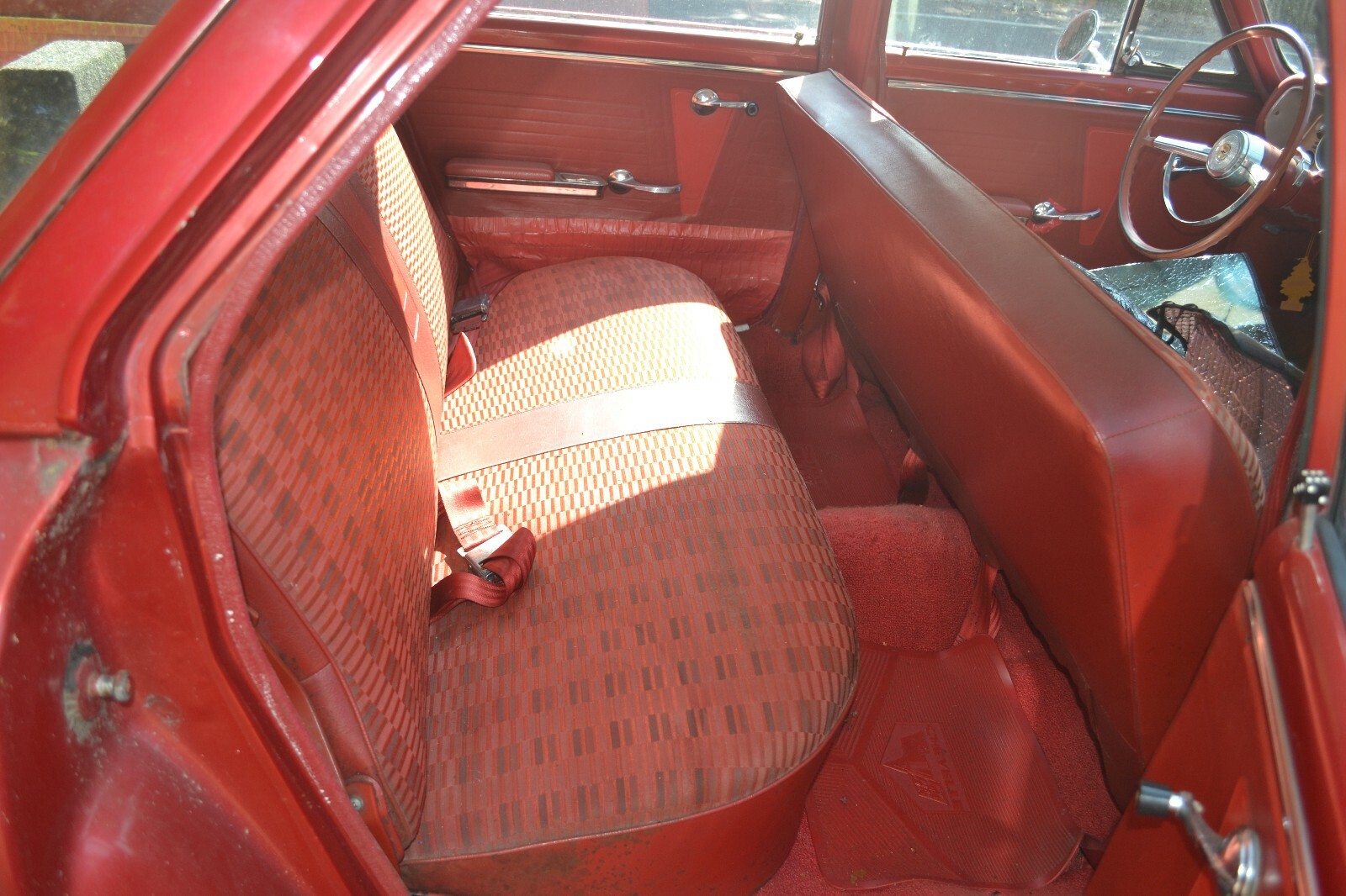 The interior looks really nice and doesn’t look like it needs much work. You can see a column-mounted tach and an aftermarket stereo under the dash, but other than that, it looks like it is in great shape. The rear seat looks just as good as the front and has enough legroom for large adults.