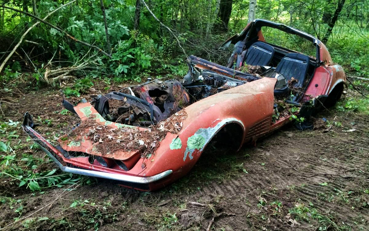 Parting out a car is almost always a shame, but this Corvette may be the exception. Now, this may not look like much at first, and truthfully it may not look like much by the end of this! This 1970 Corvette was involved in what would appear to be a very serious accident in the past and has been left to rot in the woods. While some easily usable parts such as the engine, wheels, and suspension have been removed, there are still some good pieces left. You may think I’m crazy, but for the $350 asking price, I think this could be a worthy parts purchase. Take a look for yourself here on Craigslist in Maine. Thanks to Bill W. for this unique tip!