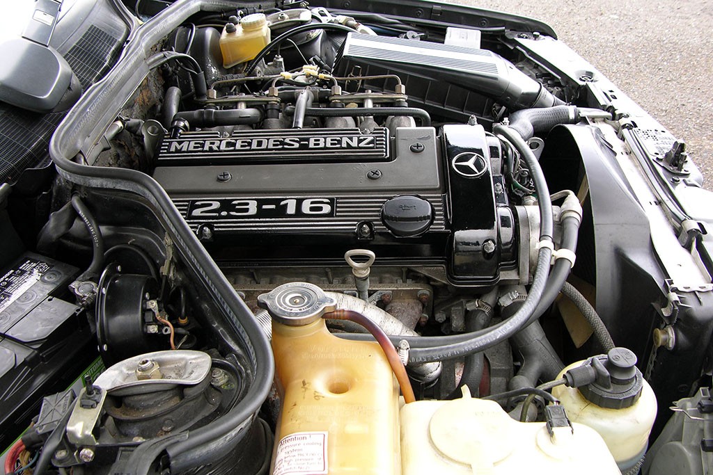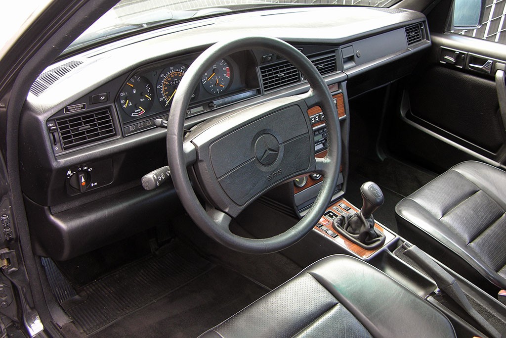 This is my favorite view of the Cosworth, I’ve decided: you can get the fullness of its profile, thanks to the fender flares and angular spoiler, while still drinking in the bodykit front and rear thanks to the generous overhangs. Mercedes offered U.S.-spec cars in two colors, the Pearl Black seen here and Smoke Silver like mine. While Smoke Silver was a popular Mercedes car across the range, far fewer 16V’s came to the U.S. wearing the darker shade. This alone factors into the perceived value of a car of which less than 2,000 were imported.
