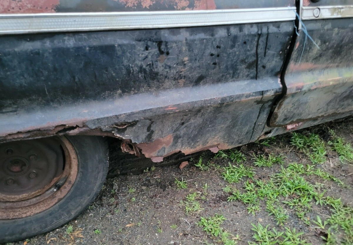 While it has rust in all the typical Impala areas it’s also interesting that the RH side of the body seems to be much, much worse. The RH side also has the typical crack where the bottom of the C-pillar meets the quarter panel (which of course is a minor defect considering what else is shot!). You’ll also be out on a search for a set of front buckets, those are not ’64 Impala SS seats. Fender badge indicates a 327, it’s also optioned with the padded dash and the somewhat unusual rear window defogger.