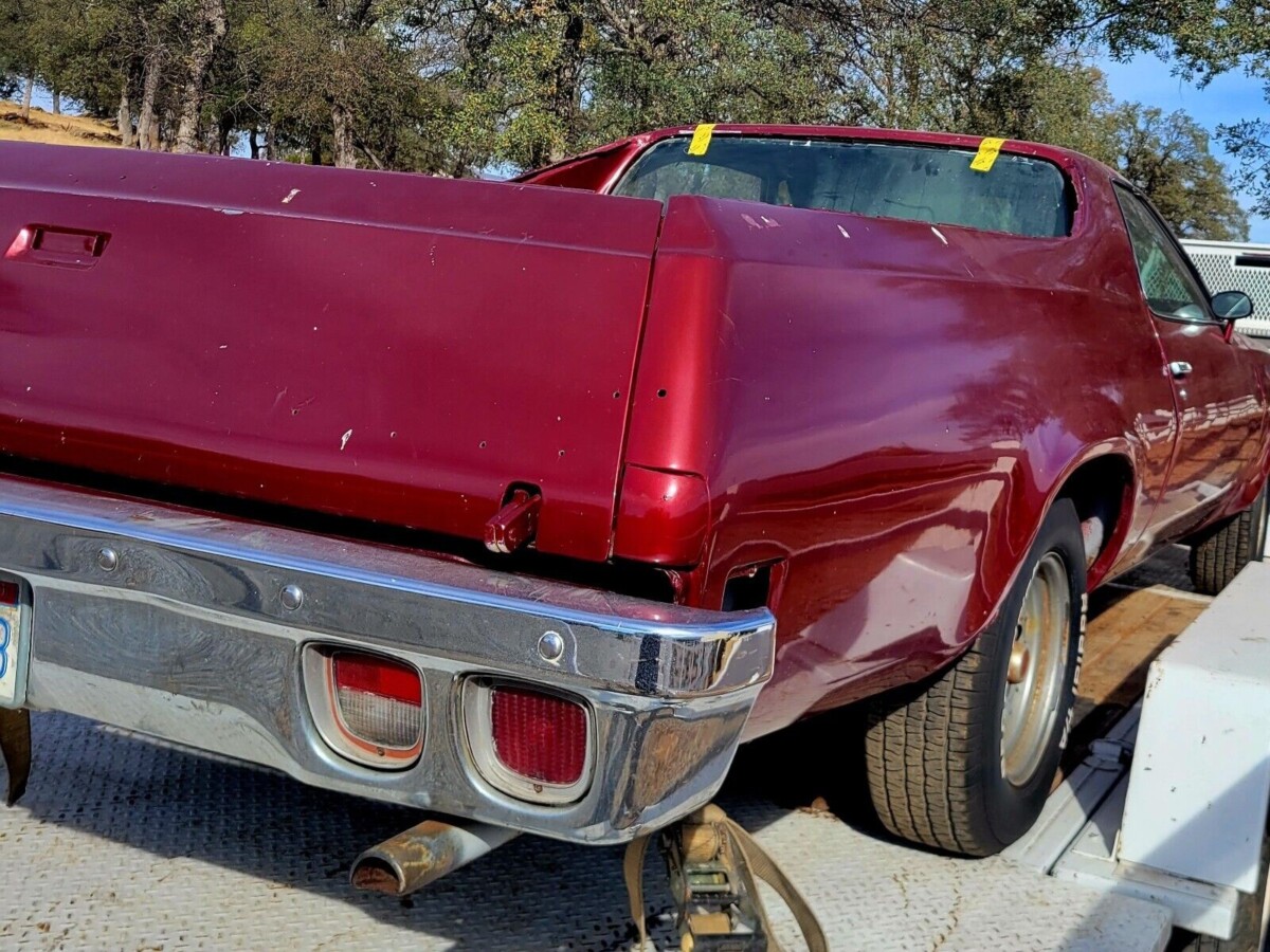 Not much in the way of history on this El Camino is offered and may not be known as the photos provided are all from the back of a trailer. It’s described as an “old project that got left under a tarp” for an unspecified amount of time. It appears a refurbishing was started with newer paint, but the quarter panels look to have been tampered with in the process. The engine block codes do not match elsewhere on the truck, so the engine (400 or 350) may have been swapped. A TH-350 automatic transmission handles the shifting of gears.
