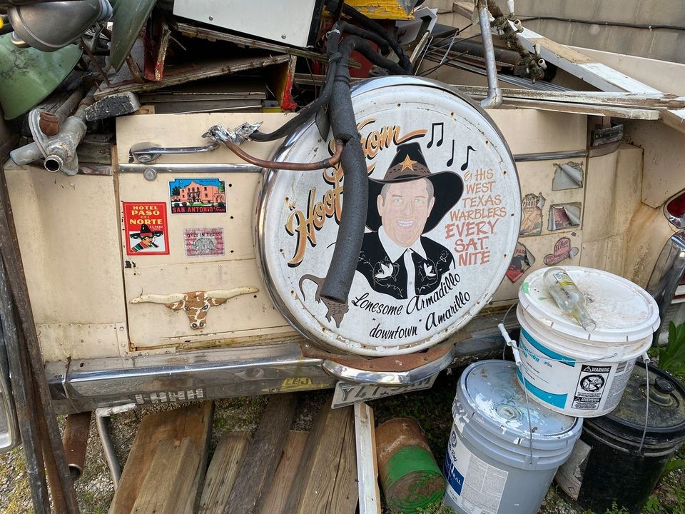 Looks like the owner was a big fan of Hillbilly singer and “movie star” Hoot Gibson. So was Granny on the Beverly Hillbillies. I’d have to remove everything from the hood and front fenders, but might otherwise keep the patina look, as you would be far underwater as soon as paint and body was done.