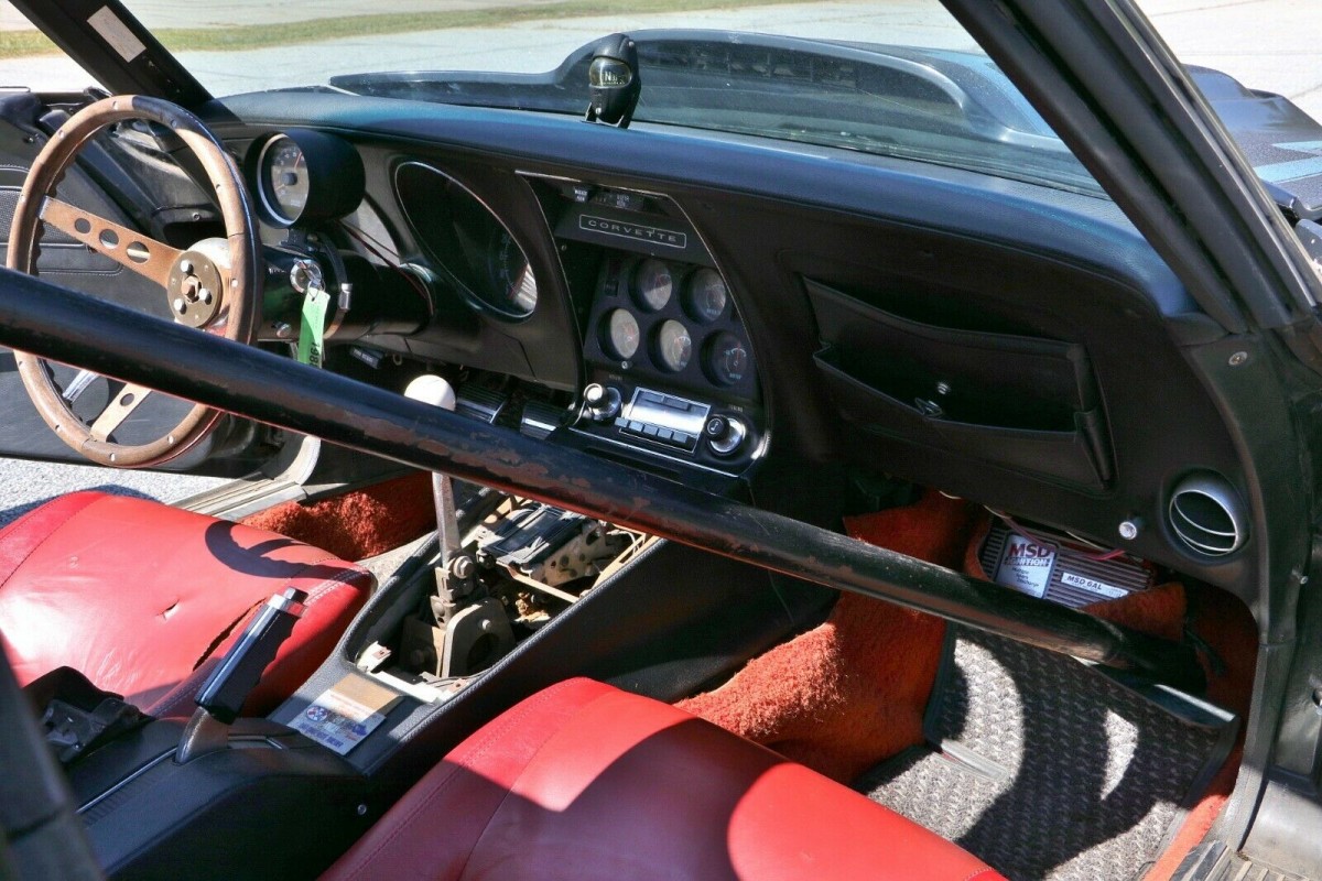 When you peek inside, it becomes even clearer that a previous owner wanted this wild Corvette conversion to be as impressive on the track as it was in its physical appearance. The roll cage is unexpected, as are some of the cosmetic enhancements, like the red bucket seats and carpeting, but if this was someone’s hot rod/track toy in the 1970s and 80s, it’s not at all surprising. The car runs and is available for a test drive at the seller’s shop.
