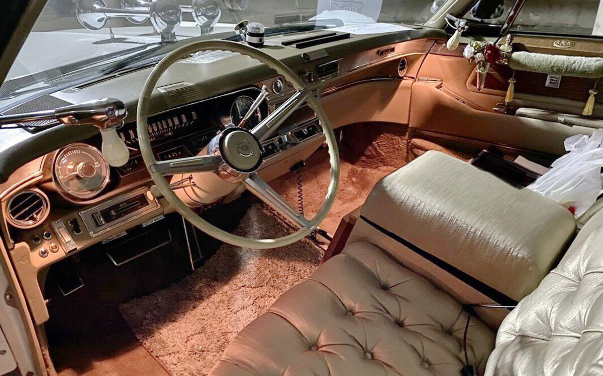 The interior is a whole’nother story. The sculptured shag carpet samples for floor mats are pretty disappointing, but I get it, they’re trying to preserve the original carpet for the next owner. The newspaper article mentions that the “Jewelry executive selected jewel tones of red and pearl for upholstery and paint…” but this doesn’t look like either red or pearl to me, so maybe Custom Craft built two of these cars (GAA!) or maybe the interior has been redone?