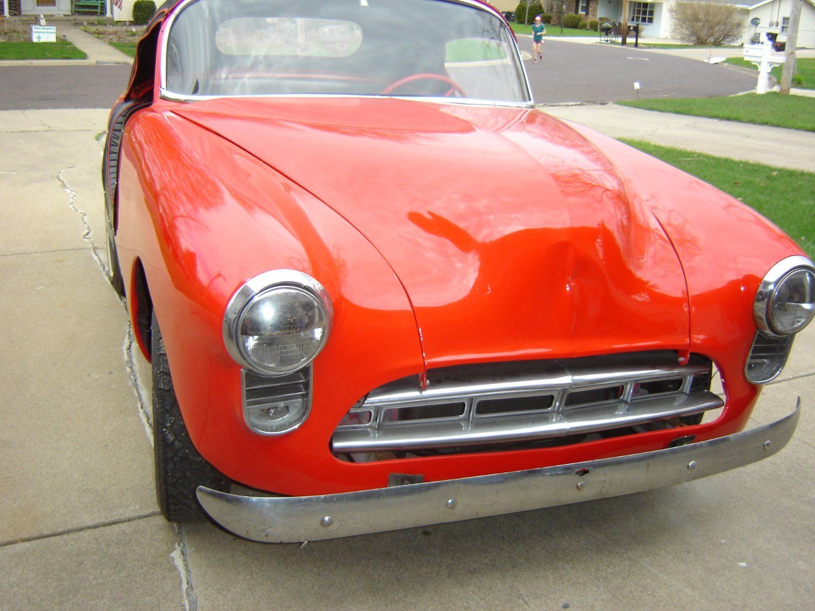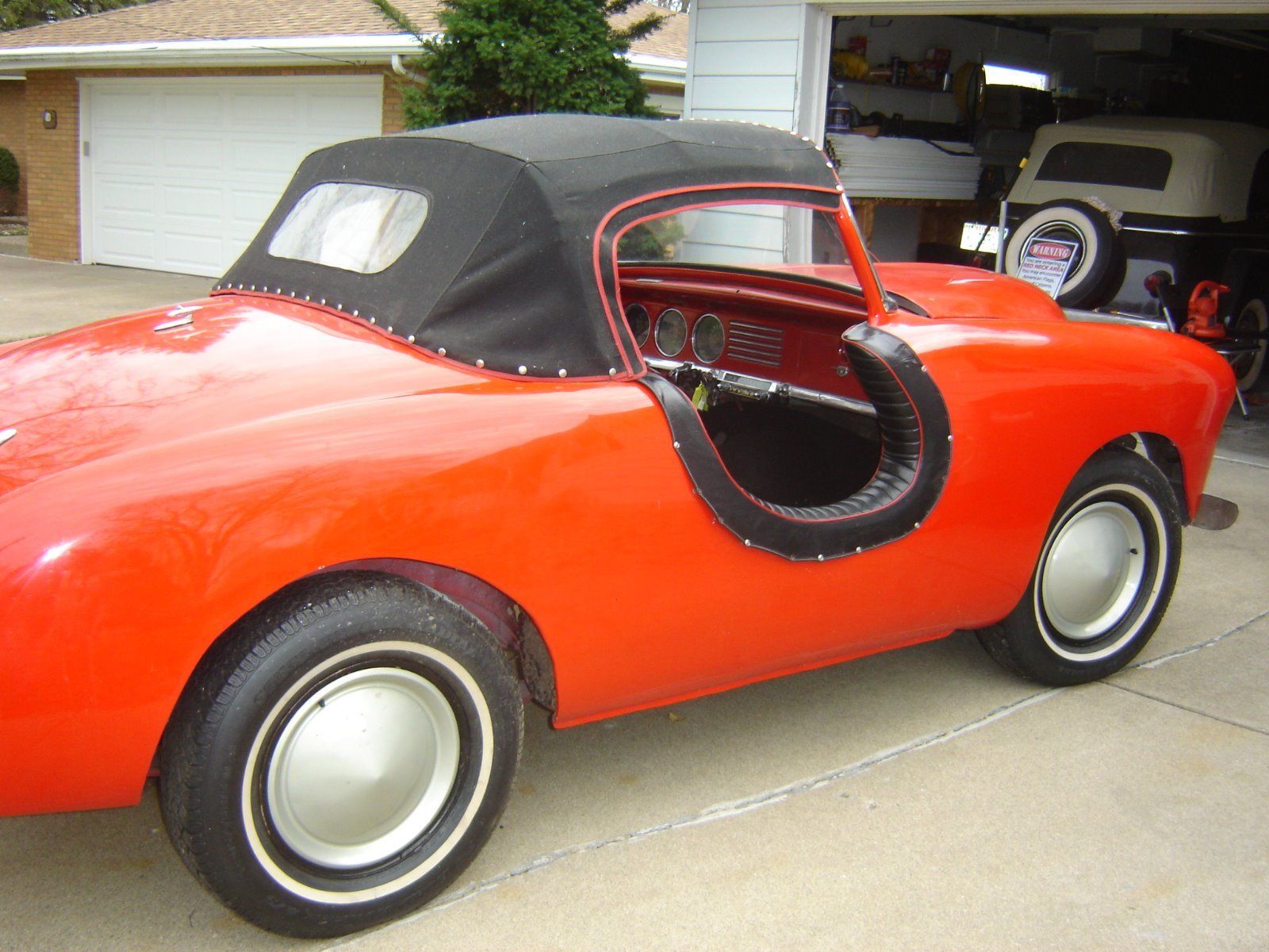 The interior is interesting with the round, padded step-over sills. The seller explains a few details, the “tires are 15in. radials in great cond. The Viper red paint shines and is very nice. The hood has a dent in front, he can explain that. The head lights are from a 1950 Olds. The snap on top is Haartz premium canvas nicely done. There is canvas doors in the trunk that has never been mounted.” It sounds like there’s work to do, the “transmission has issues going into reverse sometimes it and usually it won’t. He was told it was a linkage issue but not sure what. This will need fixed, the car is priced with this in mind. Also the builder never got around to putting on inner fenders, I think this can be done easily or drive it like it is.”