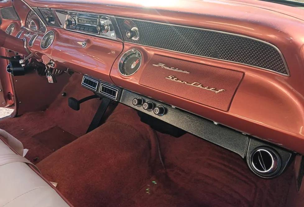 The color-keyed bronze and white exterior color scheme is carried over into the Star Chief’s cabin. What a snazzy, luxurious interior for its day. The steering wheel shows some age cracks and the door panel textured metal trim is wavy, but, overall, it’s in very good condition with what appears to be newer reupholstered two-tone front and rear seats, color-keyed seatbelts, plush carpeting, and a beautiful Firegold instrument panel and dash with chrome trim. Whoever restored this Pontiac tried to keep it factory-correct, but I live in this area of the South and hot, humid summers can be brutal. I can understand them wanting to add an A/C unit under the dash.