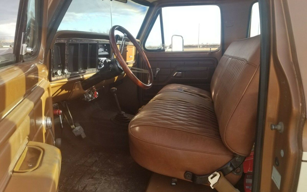 Although the truck has low mileage and is in mostly original condition, the seller says the upholstery has been re-done. You can see the diamond pattern seat covers on the twin benches has been done in a very handsome saddle-colored leather. This treatment really adds to the ranch look of the truck and is perfect in my opinion. Even the rear seat is just as nice. You can also see an aftermarket steering wheel, but other than that it looks fairly stock.