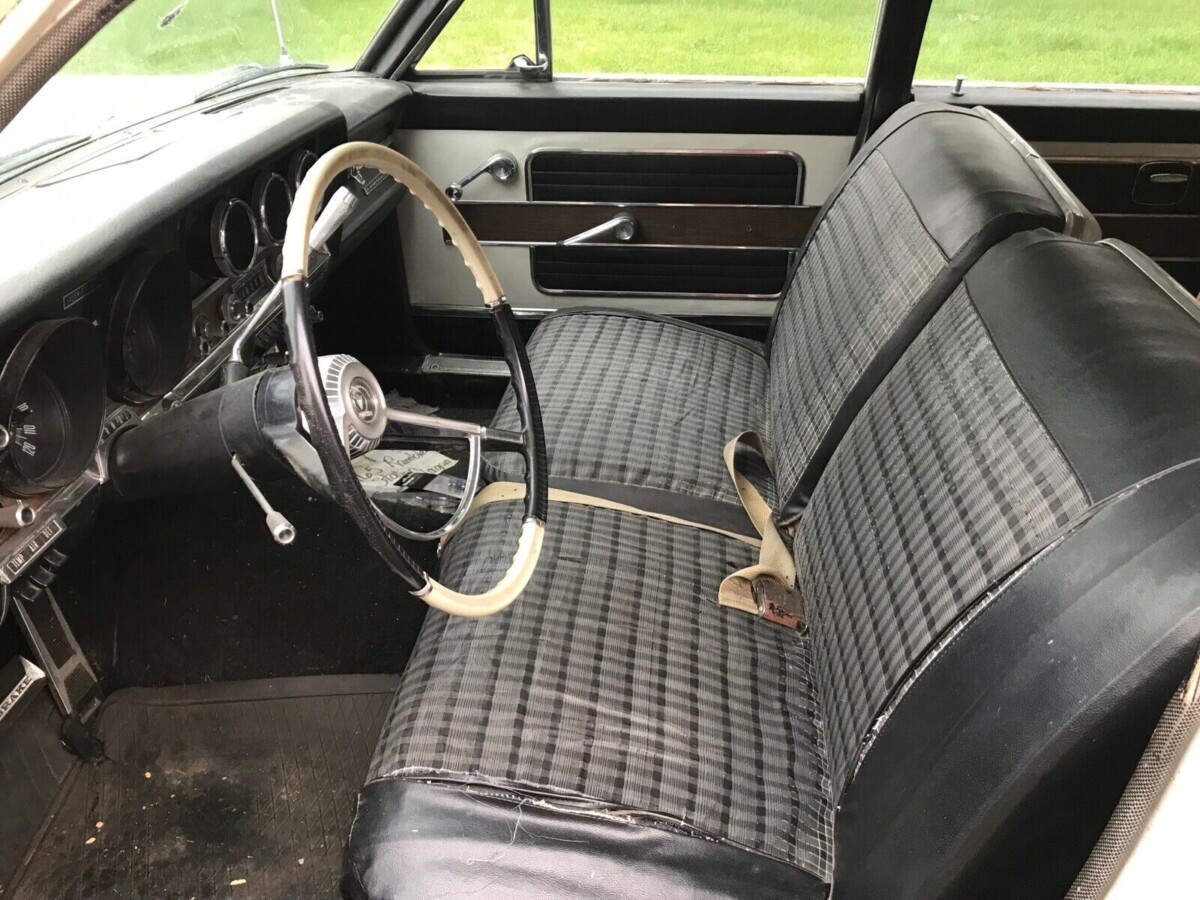 The body is not without its problem and grey primer can be seen in places where rust may have been. The lower rear quarter panel on the passenger side looks suspicious though not primed. The interior is said to be original, but the upholstery on the front seat does not match that of the back so something has been changed. There is a lot of stuff laying around inside the wagon, so it’s hard to determine how far your work will have to go in there.