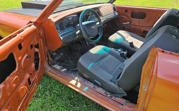 Inside is “MoFo” as the Crown Victoria’s dashboard and front seats have been installed, but the rest of the interior looks gutted. The seller doesn’t offer any additional information beyond what the images reveal, but he does state, “Most lights work, but much on the car was just mocked up.”