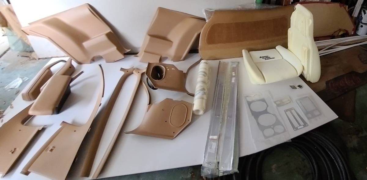 Here is a picture of some of the interior plastic parts like the sail panels, door panels, console lid, interior door arm rests and rear seat arm rests. There is also foam padding for the seats. The car is orange with a brown interior and has a reported 140,000 miles on the odometer. The Z28 is equipped with an automatic transmission, air conditioning and power windows.