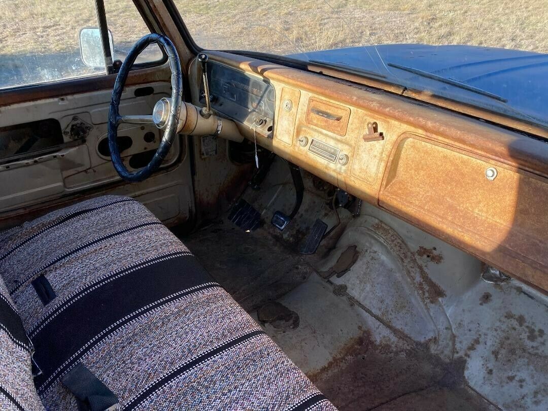 There isn’t much to write home about in the interior – it’s very simple and utilitarian. The patina continues to the metal dashboard, there’s no carpeting, and a Mexican blanket covers the bench seat.