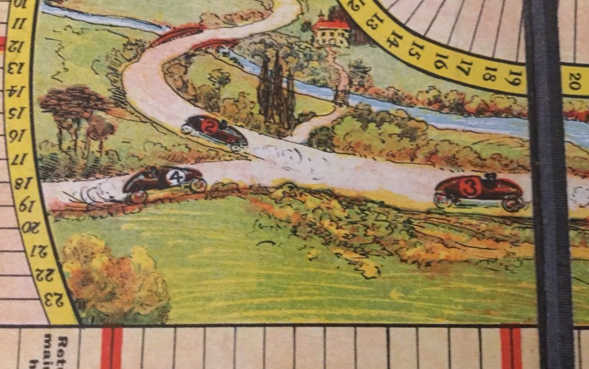Checkout the great artwork on this playing board! This appears to be a simple “roll the dice and move” kind of game similar to Candy Land, but way cooler. Instead of licorice forests and gumdrop mountains, there’s dangerous curves and downhill double speeding. Sounds like my kind of game!