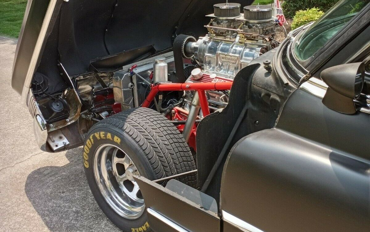 Underneath…is not a Cadillac. The sleek two-door hearse body rests on a NASCAR frame with a 108-inch wheelbase. You get tubular steel in all the right places (all the places) to protect you from a crash, and enough torsional rigidity to support the car under speeds only ever seen on race tracks. There doesn’t appear to be any rust, dirt, or grime, and the tires look wide enough to have different zip codes on each wall. The body is for decoration only, but it will likely give a more comfortable ride than the race car donor as a happy side effect.