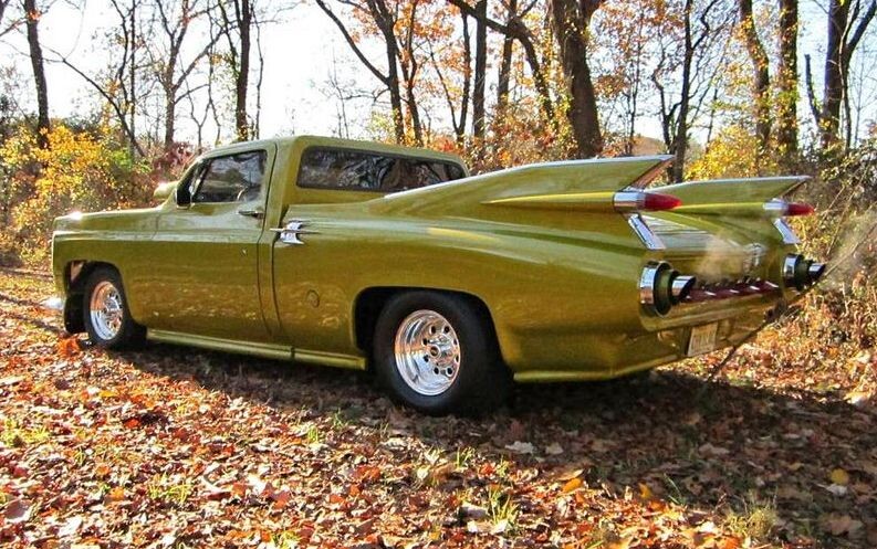 I swear I have seen this rig before: a C10 with ’59 Caddy quarters on it. Even in this color – but definitely not those headlights.