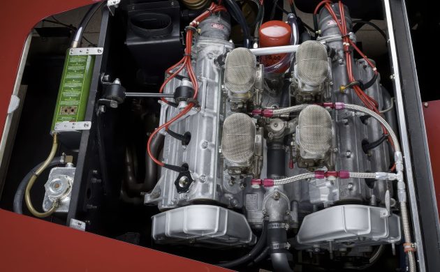 The transverse 2.9L DOHC V8 draws air through a quartet of bug-screened Weber 40 carburetors. Part of the 2018 rebirth included a timing belt, new seals, tuned carburetors, and valve cover gaskets. Ferrari shows the original making 255 HP, probably in EU specifications, and Hagerty shows the same for America, which should prove quite entertaining in this open-bodied racer.