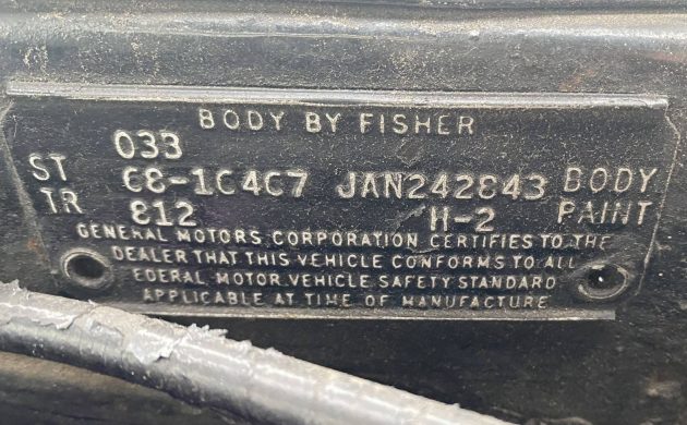 The seller says his car is a true Super Sport, with the 812 on the cowl tag seeming to point in that direction, as that number indicates black bucket seats. Other useful information from the tag is the paint code, which tells us the Impala began as a Grecian Green example (code “H”), with a white convertible top (code “2”).