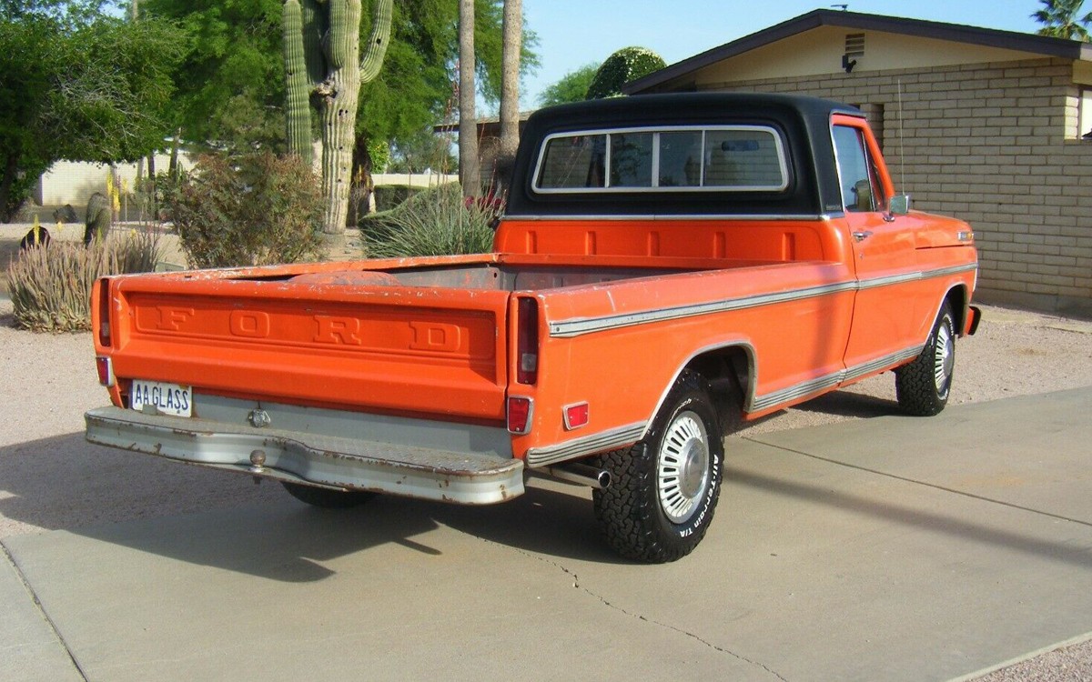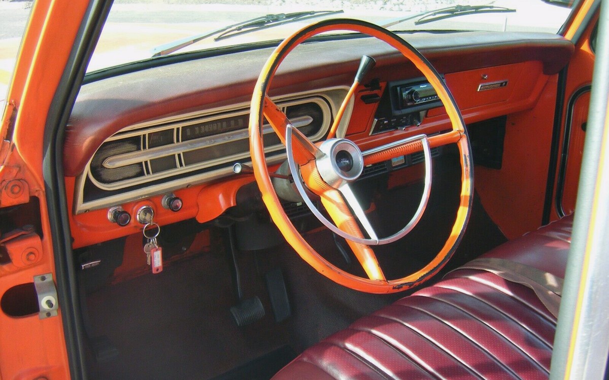 The short-wall bed is jarring and so is the red dash and red bench seat in an orange truck. The seat looks perfect but I would change out the seat and dash color asap if it were mine. We had a 1969 Ford F-250 in orange so I have a strong urge to get another one someday and I actually like the unusual custom short-sided bed since I like unusual vehicles or unusual features on otherwise normal vehicles.