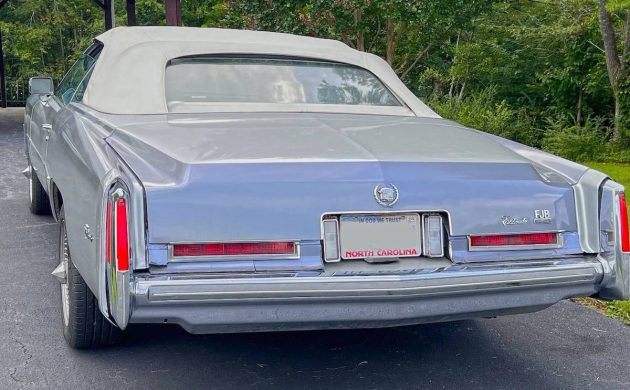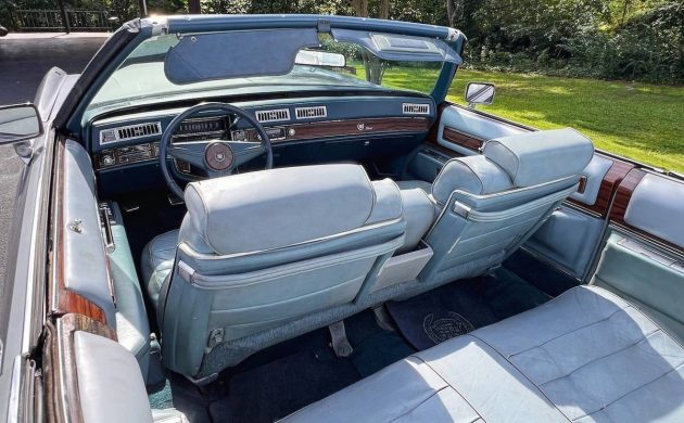 We’re told the big Caddy runs great with a huge 500 cubic-inch V8 that, of course, comes with an automatic tranny. The power top works as it should, and if you don’t care for the 18” wheels on the car now, the seller has kept the originals. The leather seats are where the TLC reference comes from and would need refurbishing if you’re looking to collect awards (probably just fine as-is for cruising or Cars & Coffee).