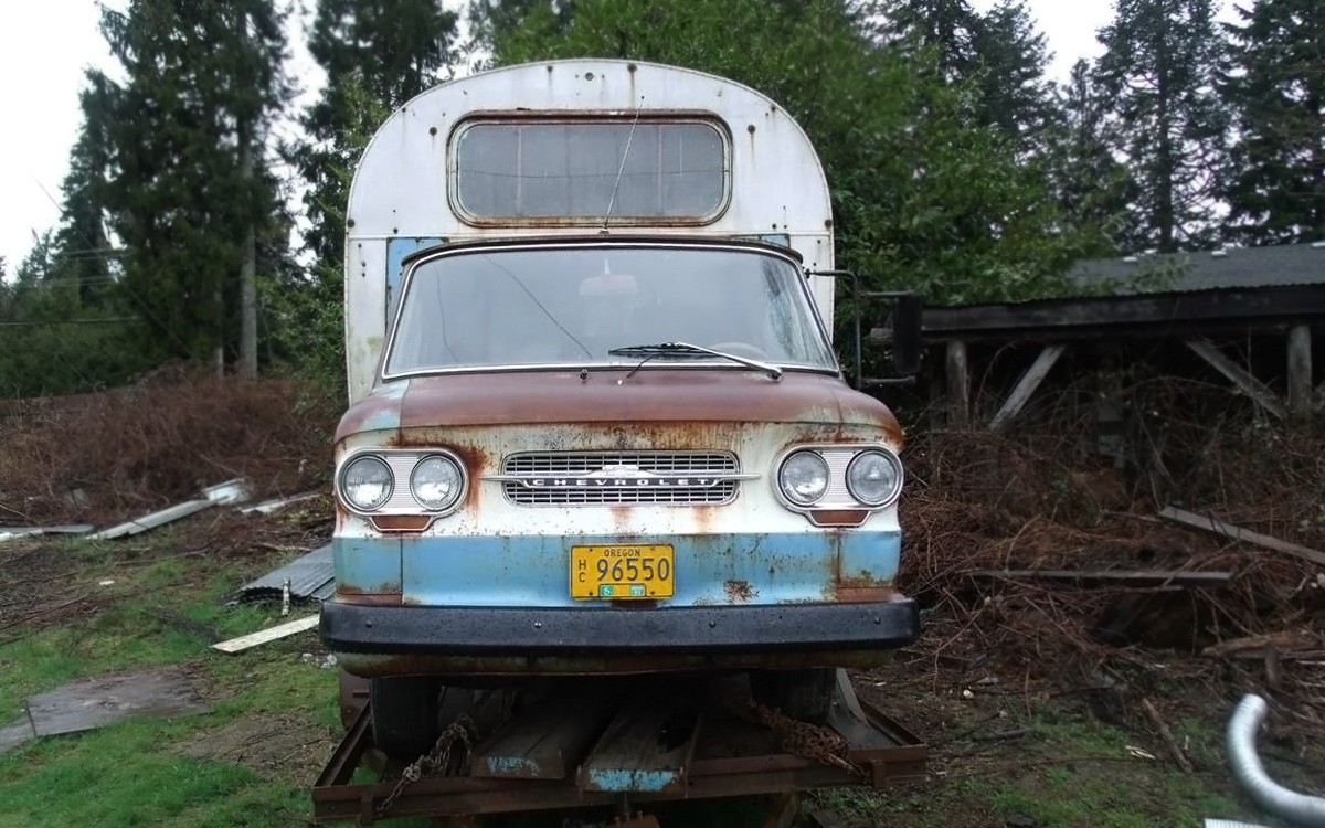 Wow. I’ve seen purpose-designed campers from back in the day mounted on Corvair Loadsides and Rampsides. This looks like a TOTAL NIGHTMARE! Even if this rig was registered, insured and modernized that power plant should be replaced with a 140 hp or better ‘Vair motor as you won’t get anywhere fast.