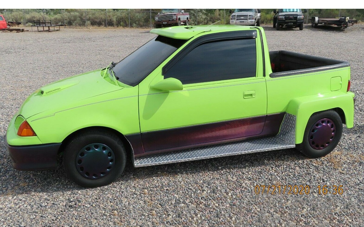 Ummm… so yeah. Well, this is an unusual one. How much time do I have left? (looking at the director) I actually thrive on oddball vehicles like this 1993 Geo Metro dually pickup, so when an anonymous Barn Finds reader sent in this tip I couldn’t resist. Thanks to whoever that was, I think. This unusual and tiny six-wheel hauler can be found here on eBay in Riverton, Wyoming, where I’m assuming that it stands out like Scotty G in shorts and black socks. The bid price is $4,900 already and you’ll have to get your bids in soon because the auction ends in less than a day! Let’s check it out.