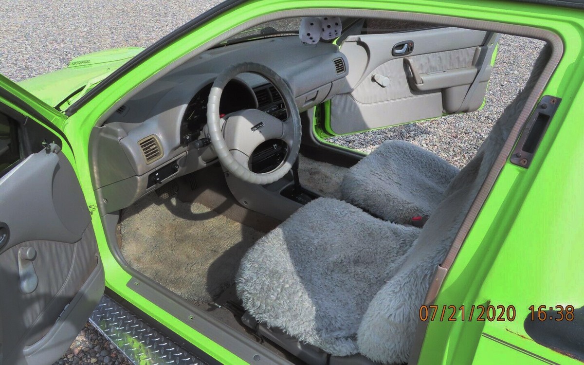 This is the only interior photo other than one showing the speedometer and odometer and unfortunately, this one has an automatic transmission. Most of us were hoping to see a 5-speed here. These little Metros can be fun to drive with a stick shift. It looks good inside, though. I don’t think lime green was a factory color, I don’t see it online anywhere but it sure looks like it was. If not, it has had a pretty nice and extensive respray because they must have taken off all of the trim and gaskets and things like that. The photo of the bed shows red paint under black but who knows. It does have some body issues to deal with, there are cracks in the bodywork and general fitment issues in a few areas and generally needs a little help to take it to the next custom level.