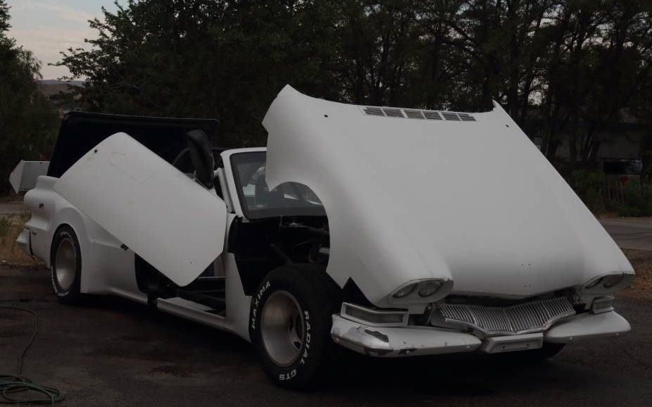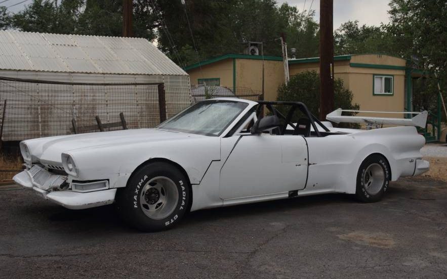 Under the flip-up front end, and nestled between the roll cage extensions, is an Oldsmobile 455 CI V8 that has been punched, stroked, or both out to 472 CI and is capable of producing a claimed 500 HP. There’s no mention made regarding operating prowess but it’s probably one of those sit-down, strap in, and hold on kind of affairs. A GM Turbo-Hydramatic 400, three-speed automatic transmission applies the grunt to the rear wheels.