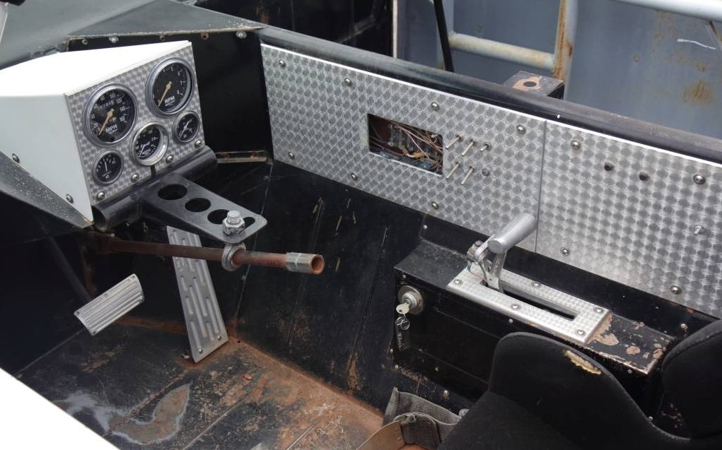The interior has two separate compartments, one for the driver and the other for a tag-along rider. It is a complete custom affair with a spec-built instrument panel and gear select lever housing. Custom racing seats have been employed but it looks as if safety harnesses haven’t made the inclusion list yet. Of note is the windshield frame, based on the shape and rake, it came from something other than a ’60 Dart. While the interior is hardly NASCAR Cup Series spec, it’s pretty impressive for what is probably a home-built, do-it-yourself job.