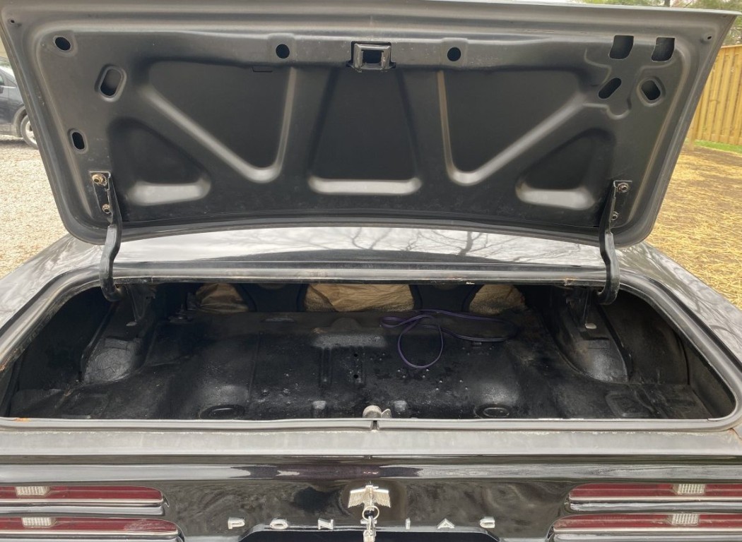 Inside the Firebird, it sports an aftermarket set of front bucket seats, but they’re well-worn and will require reupholstering. We’re told the seller still has the original front seats, so you could switch back to those for a stock look. The dash pad has one crack in it and the headliner has separated back where it meets with the back seat. The woodgrain finish on the console may be faded and there is some tearing at the bottom of at least one door panel. But overall, the interior is quite passable if you wanted to drive it while you worked on it.