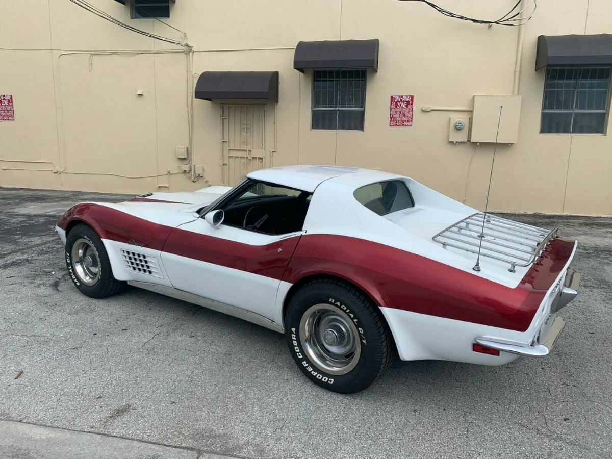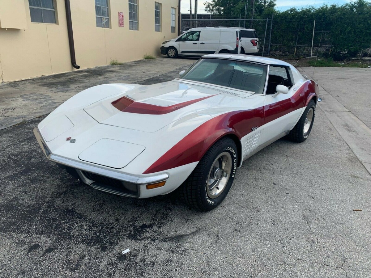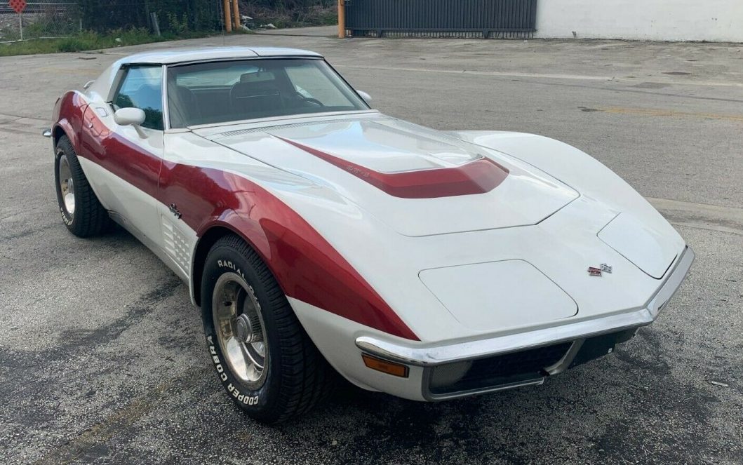 It is funny how you can place the design of an object with the decade and culture that spawned it. One example would be Graceland. While today we might be a little hard on Elvis for the amount of shag carpeting in the place and the avocado green kitchen appliances, the king’s home is unmistakably a product of American in the 1970s. You could also say the same for this 1971 Chevrolet Corvette Coupe. Being sold here on eBay out of tropical Miami, Florida, this white Corvette with candy apple red accents just screams the seventies. It also has one of the most desirable options of the era: an LT-1 engine. While the optional engine makes this car much more valuable, does the disco flair add anything for you? With bidding at just $9,378, is the custom paint holding back collectors?
