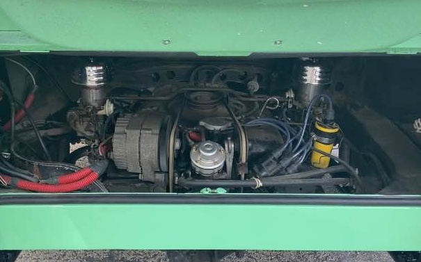 One good thing about choosing this VW to shorten is that there’s no driveshaft cutting involved, so that’s one less detail to worry about. I was expecting to find a stock engine in the rear compartment, but that area has been customized as well, with that component removed and replaced with a 145 cubic-inch flat-six sourced from a 1962 Chevrolet Corvair. Commonly known as the pancake, this one’s also air-cooled and seems right at home here. It’s connected to a 2-speed Powerglide automatic, which is said to have just had the fluid changed. Other recent mechanical services reported include a carburetor rebuild, a fresh tune-up, and a remanufactured starter installed.