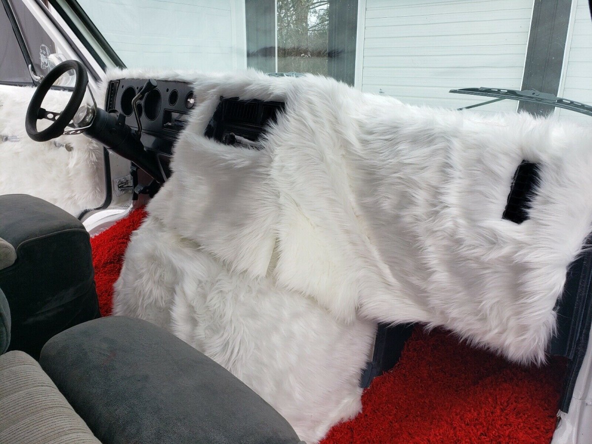 Remember “Don’t Come Knockin’ When This Van’s Rockin’”? This van, with an amazing multi-colored metal-flake paint job, is the very embodiment. It’s a boudoir on wheels. The van is carpeted in inch-thick blood-red shag, with the sides and ceiling in 1.5-inch cut pile shag. More bright-white shag—looking like the hide of an Afghan dog—covers the dashboard and other extremities. Don’t spill coffee on it.