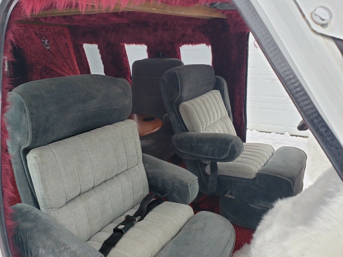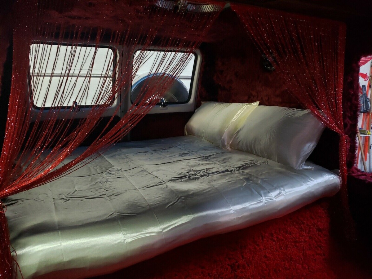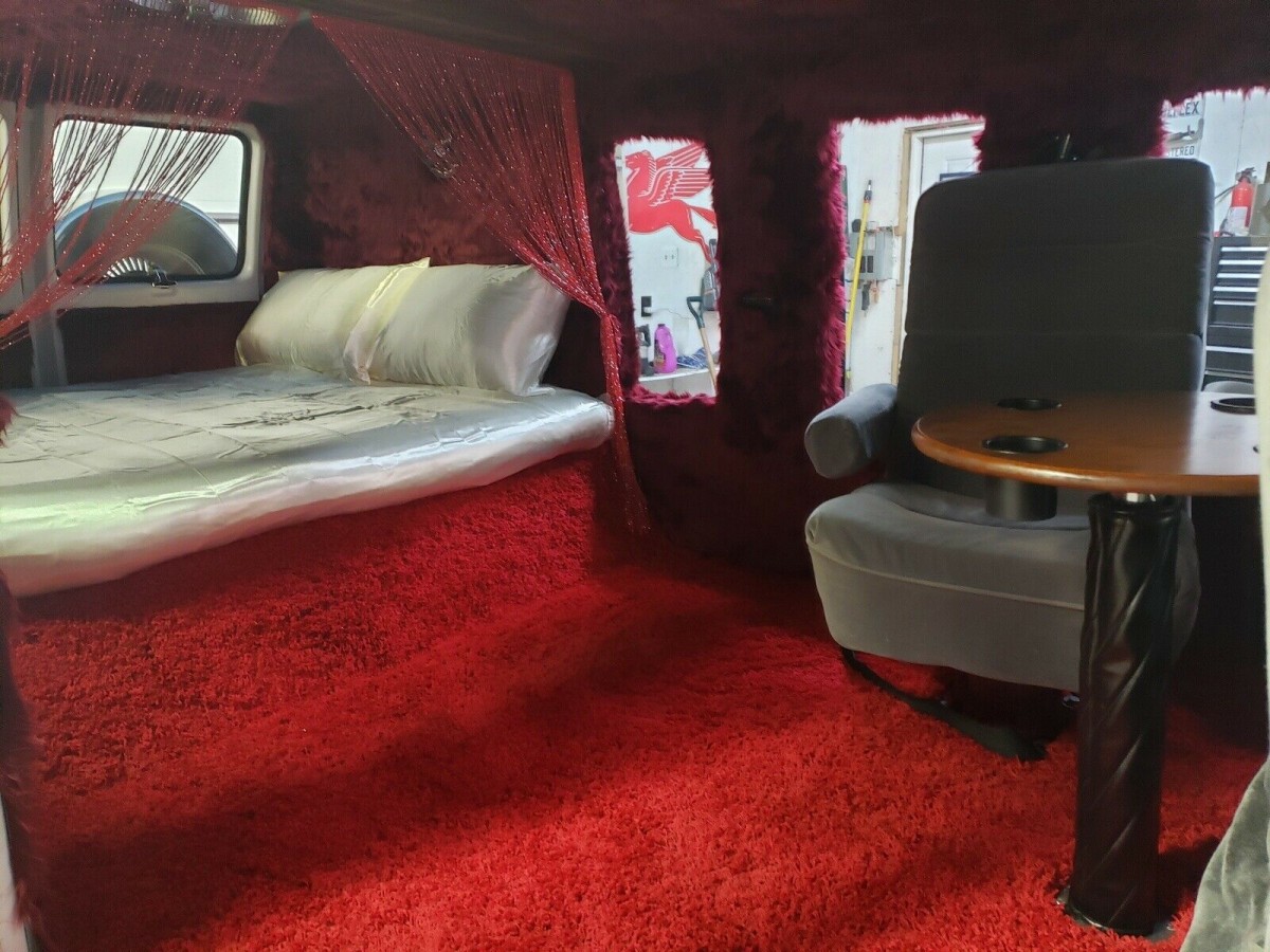 In the old days a roue would invite a gal to come upstairs and see his etchings. In the period of Dazed and Confused (see it immediately if you’ve somehow missed it) the invitation is into the back of the van. This one is outfitted with an eight-inch thick mattress mounted on a storage-friendly plinth, with appropriate come-hither red draperies and, I kid you not, Champagne Satin sheets. There are three swivel seats with a convenient oak table, too. The front thrones, two-toned in shades of gray, are just about the only restrained element in the van.