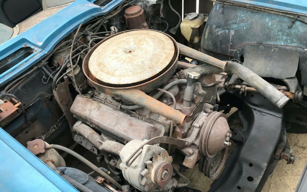 The engine compartment could easily support the claim of being parked since the ’70s, but it appears to have avoided the application of hot-rod parts. Even the air-cleaner housing looks factory.
