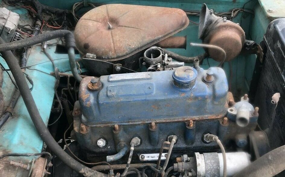 The exterior has supposedly been poorly repainted. The codes indicate that this Nash was originally finished off in Berkshire Green (code P912) with Frost White (code P914) as the contrasting color. It would seem that the repaint was at least in the original shades if applied poorly, as suggested by the seller. Obviously, there is a lot of surface rust present though the seller claims the body is Bondo-free and solid as is the structural part of the subframe. What’s not solid are the floor pans and the seller suggests that they should be replaced. The convertible top fabric doesn’t appear to have much going for it but the folding frame is at least present so that’s helpful.