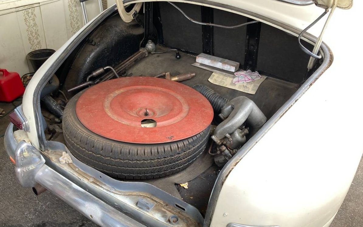 Besides the obvious right-hand drive, the seller opines, “Has beautiful wooden dash and door panels, super cool signals and many beautiful details not found in more modern cars“. I must agree with the woodwork description, it is beautiful and has survived well for being 70 years of age. The glovebox door looks like a cigar storage box or humidor that one would see in a smoke shop. The seating upholstery has a sort of two-tone orange and red thing going on but that may be due to the tops of the backrests (sun damage?) being reupholstered in a non-matching fabric. All in all, it’s still a very presentable environment.