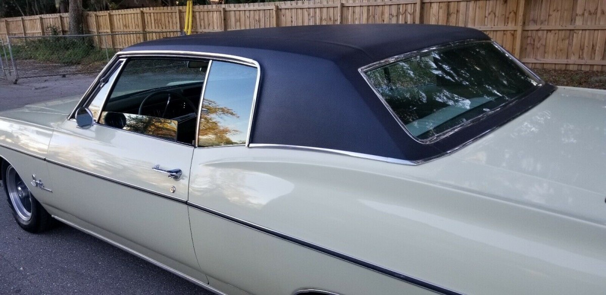 This automobile is described as an original with updates to the exterior, interior, and drivetrain. For the body, that means it’s had a repaint recently That’s quite nice. No signs of any dents or rust or repair work that may have been done. It has the looks of a professional and thorough job. The chrome, trim, and glass are in great condition and the seller tells us the undercarriage would hold up well under scrutiny. The vinyl top was also replaced recently.
