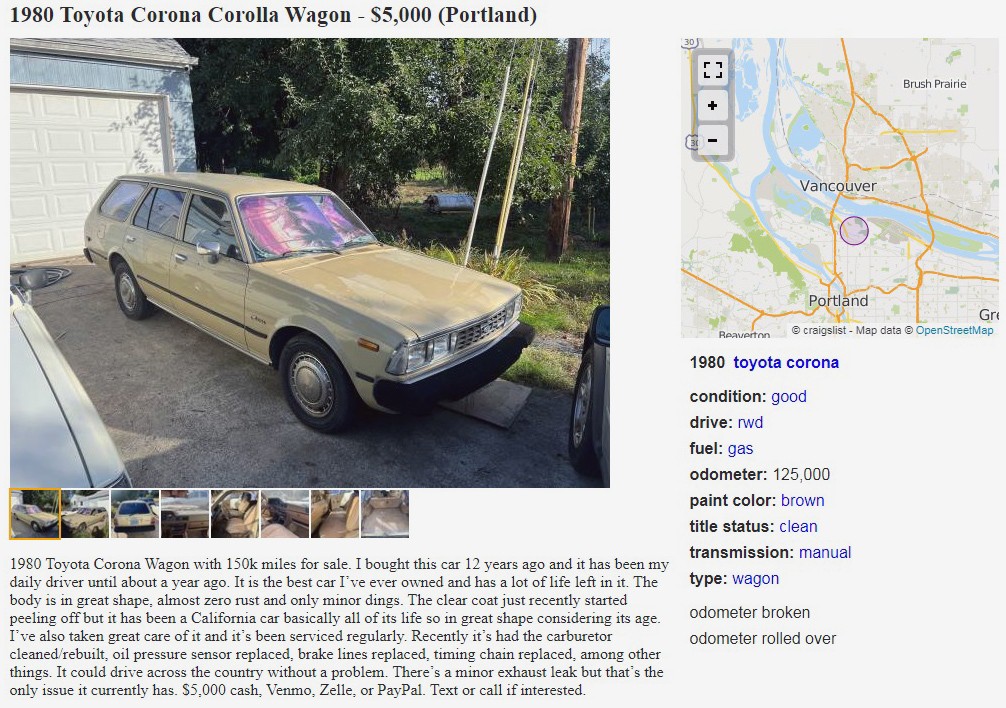 Ok, maybe not the sin of not including an engine photo. They speak so highly of it, too, you’d think they would want to show it off. It’s Toyota’s 2.2-liter SOHC inline-four with 90 horsepower and 122 lb-ft of torque when new. They say it has a slight exhaust leak, and that’s all there is to do. Otherwise, “it’s had the carburetor cleaned/rebuilt, oil pressure sensor replaced, brake lines replaced, timing chain replaced, among other things.” They say you could jump in it and drive across the country easily, and I believe it. Have any of you owned a Corona wagon?