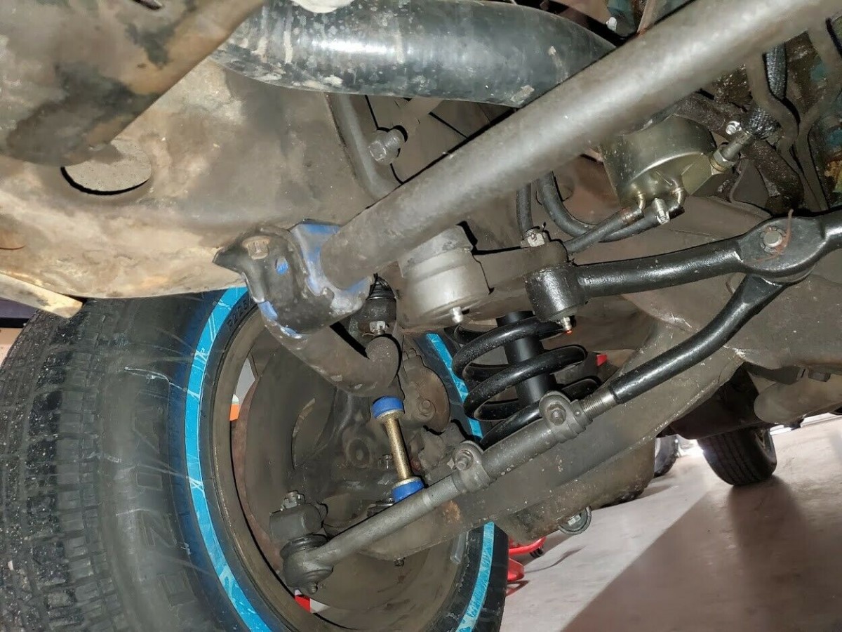 Underneath, a lot of time and money has been spent. At the front, you can see the new springs, gas shocks, and polyurethane control arm and anti-roll bar bushings. All of the front subframe body mount bushings were also replaced with polyurethane bushings as well.
