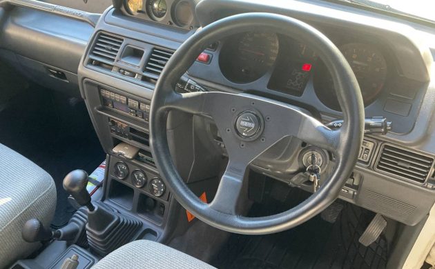 But examples like this will always be in demand. The Pajero was one of the most successful factory-backed motorsports efforts, with an emphasis on the grueling Paris-Dakar Rally where Mitsubishi took a wild top 3 finish in 1992. It cemented the truck’s reputation for being not only incredibly durable but also a fine competition vehicle. This example is outfitted with all of the goodies enthusiasts want, starting with the 5-speed manual, a 4D56 2.5 intercooled turbo diesel (around 100 horsepower and 177 lb.-ft. of torque), Momo Monte Carlo steering wheel, giant Cibie Super Oscar fog lights, a Ralliart gauge pod, electronically-adjustable shocks, and more. This example also shows only 77,000 KMs, or roughly 48,000 miles.
