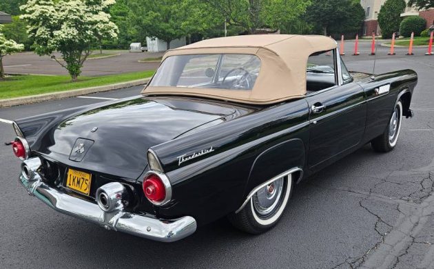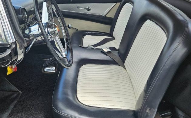 The engine’s an interesting story because ’55 T-Birds were available with only one engine: the 292-cubic-inch Y-Block V-8 that generated 193 horsepower. The seller claims the ‘Bird’s larger 312-cubic-inch V8 was installed at the factory. Perhaps this Thunderbird was built towards the end of the ’55 model year run and the 312, an optional engine available on the ’56 T-Bird, was put in at the factory by request. Nothing is mentioned about documentation on this possible anomaly. Mileage is listed at 87,738 and the seller says the T-Bird “starts right up, runs well, and there are no known mechanical issues.” In the rebuilt/replaced department, the carburetor has been rebuilt, the solenoid and wiring for the transmission’s overdrive unit have been recently replaced, an electric fuel pump has been added, the timing and dwell have been recently adjusted, and the ‘Bird’s battery is brand new. This nice-looking Black ‘Bird is located in Lansdale, Pennsylvania and is listed for sale here on craigslist. The seller has a $40,000 asking price on it but says it’s negotiable. Ya know, there’s a reason why so many Raven Black T-Birds were featured in print ads and other marketing pieces back in 1955. It looked classy and sporty back then and still does 70 years later!