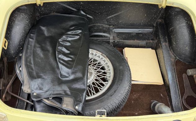 The trunk has a spare tire and wire wheel, and you get the tools to remove the wheels nuts (including hammer). It looks like there’s a folder full of paperwork, which is always interesting (or horrifying) when you’re buying a new-old car.