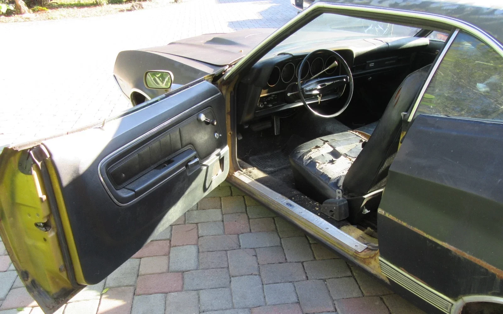 I’ve never been a fan of “Hot Rod Black,” the flat black paint that this car currently wears (it also could be plain old black primer, but let’s hope it’s epoxy if that’s the case). There is hope for a brighter future, however, because the inside of the trunk and door jambs shows what is certainly the original color, and it appears to be Code 6E “Medium Bright Yellow,” a great-looking color on Gran Torino Sports.