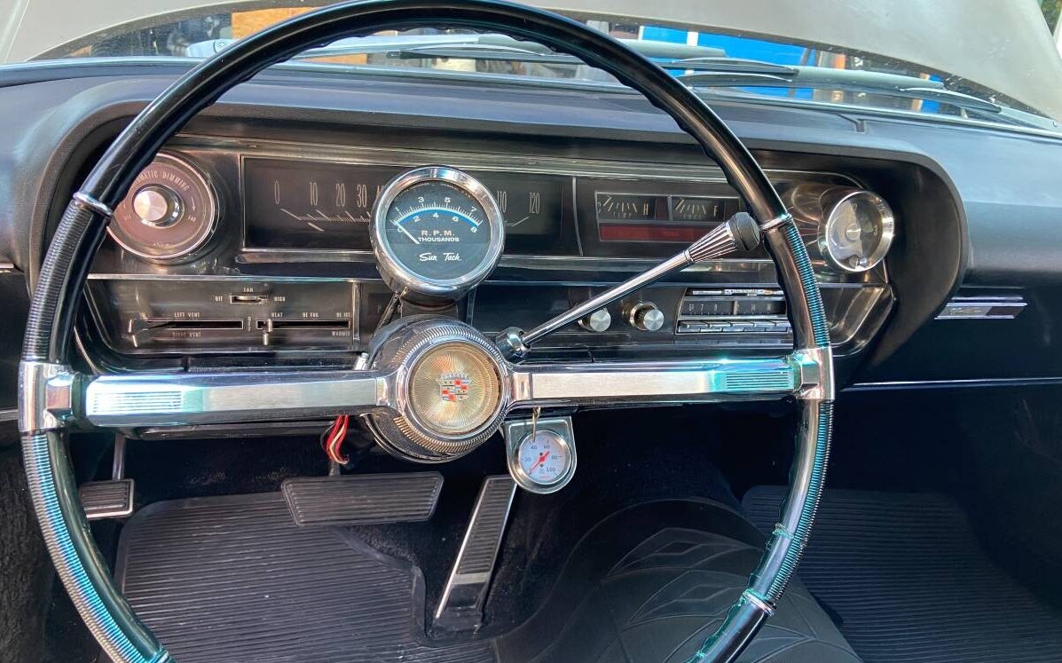 The only updates from stock include a column-mounted “Sun” tachometer and a single under-dash auxiliary gauge. The HVAC control head is the standard piece meaning it has HV but no A/C – it was still an option for Cadillac in ’64.