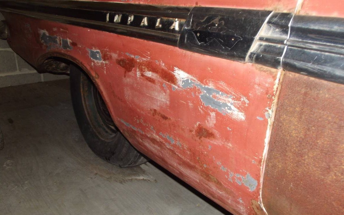 The seller states, “I have owned this car for 40 years. Clean NJ title, and 99% complete. I know it’s a barn find, as it’s been in my Barn and has not seen daylight in all these years“. Hmmm, if you know you own it, and you’ve known it all of these years, how can it be a find, regardless of where it is parked? Isn’t it more like a barn resident that you just happen to own? And, can it be a barn if it looks pretty recent and is built from cinder blocks? Ok, ok maybe I’m digressing on that one a bit. The seller further states, “Solid as a rock, not one body panel will need to be replaced, 99% complete“. It’s hard to tell, considering the quality of the images, there isn’t a single one of the car in its entirety and nary a glimpse of the famous fins! Of note, is what looks like rot in the lower passenger-side fender that doesn’t exactly instill a “solid as a rock” assurance. OK, only one noted potential rust-through, so far, but the body, in places, besides the obvious surface rust, looks to have a close association with Bondo, at least from a skim coating perspective; why else all of the primer? To add to the excitement, this big Chevy is missing some of its very extensive stainless trim. Obtainable? Probably, but at what cost? The seller states that the floors are solid and there is one image attesting to that claim.
