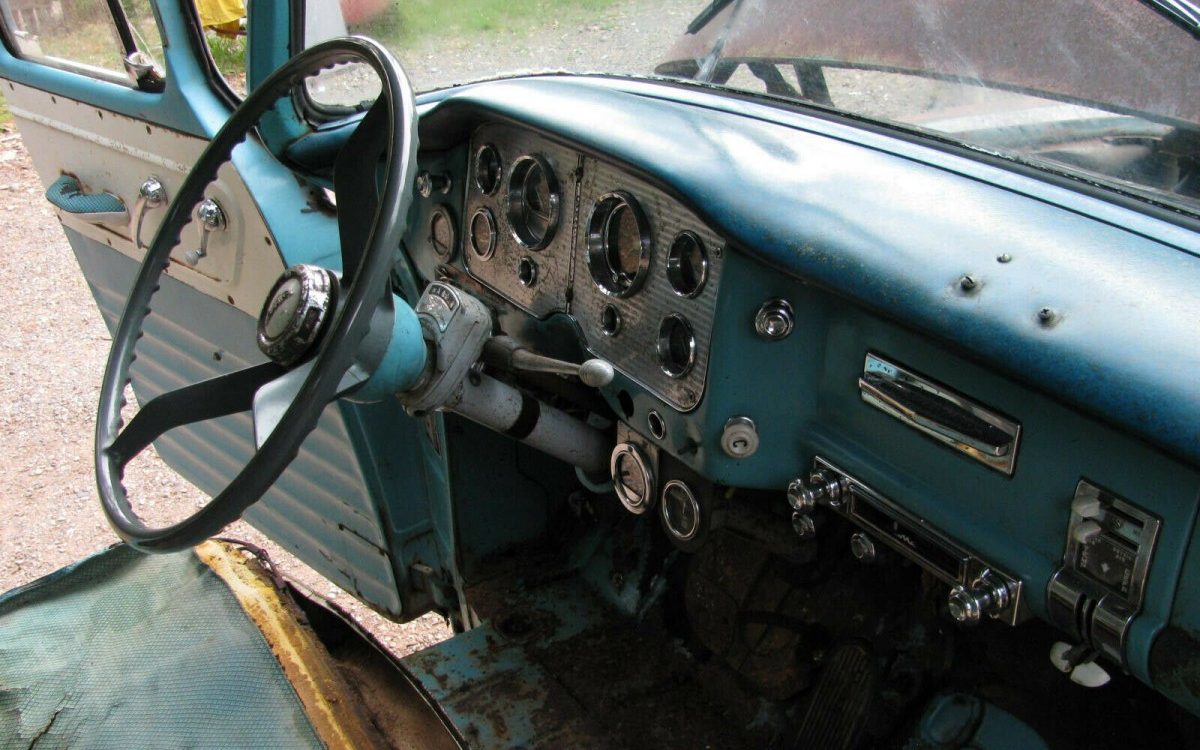 The thing that shocks me is it’s a 4×4 with chrome and the light blue paint continues inside the cab. It seems like the only trucks like this that came with chrome back then were originally fire trucks.